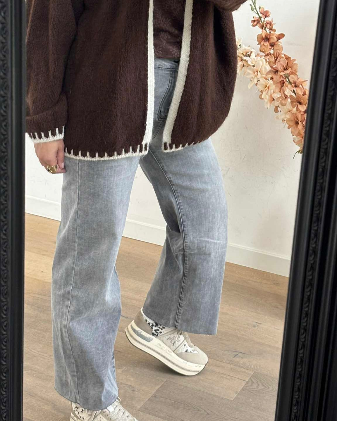 - Coupe droite, légèrement ample au bas de jambe, bord non fini