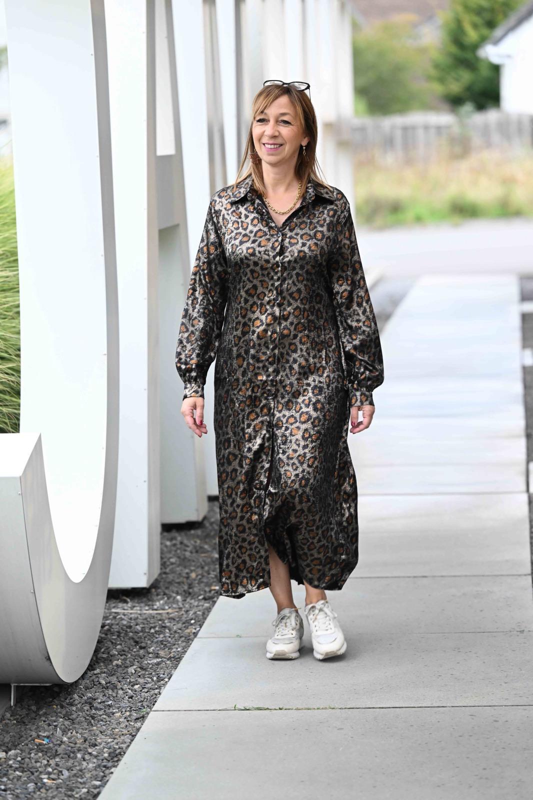 Une robe chemise audacieuse au motif léopard métallisé, parfaite pour briller avec élégance. Sa coupe fluide et sa ceinture à nouer marquent joliment la taille tout en restant confortable.