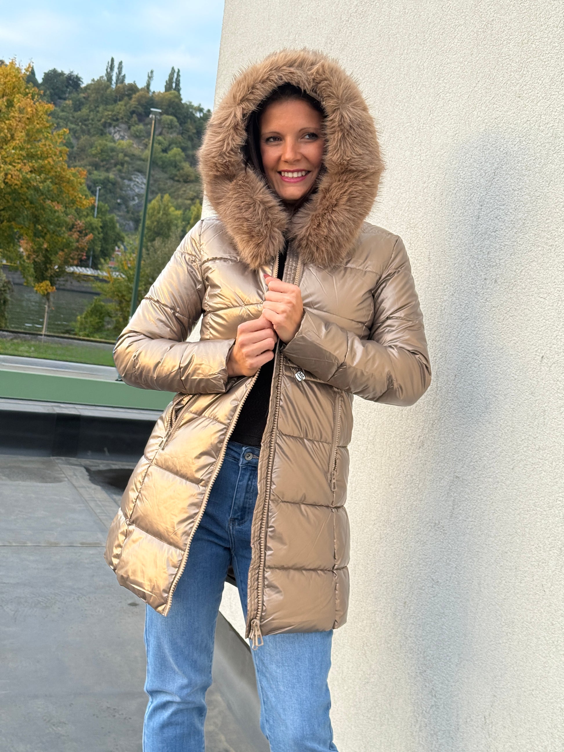 Chaleur, confort et élégance 💫 Cette doudoune mi-longue à la teinte bronze métallisée illumine l’hiver tout en restant sobre et raffinée.
