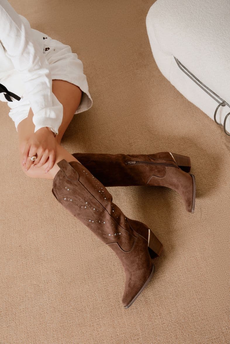Ces bottes camel en suédine allient confort et style grâce à leurs détails ajourés et cloutés, parfaites pour twister toutes tes tenues d’automne.