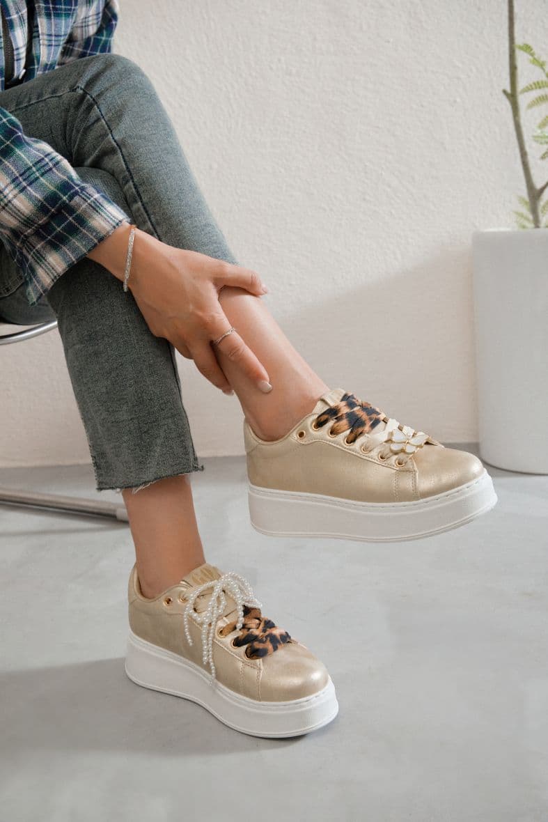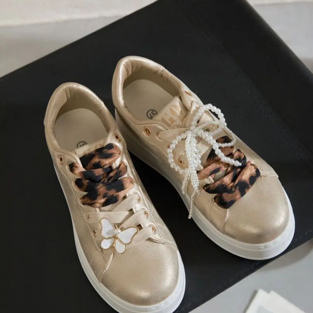 On craque pour leur doré lumineux et leurs détails ultra-féminins : lacets imprimés léopard et ruban de perles, sans oublier le petit papillon doré qui fait toute la différence 🦋