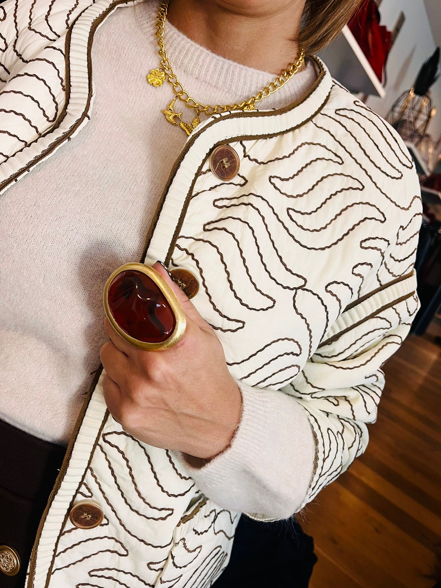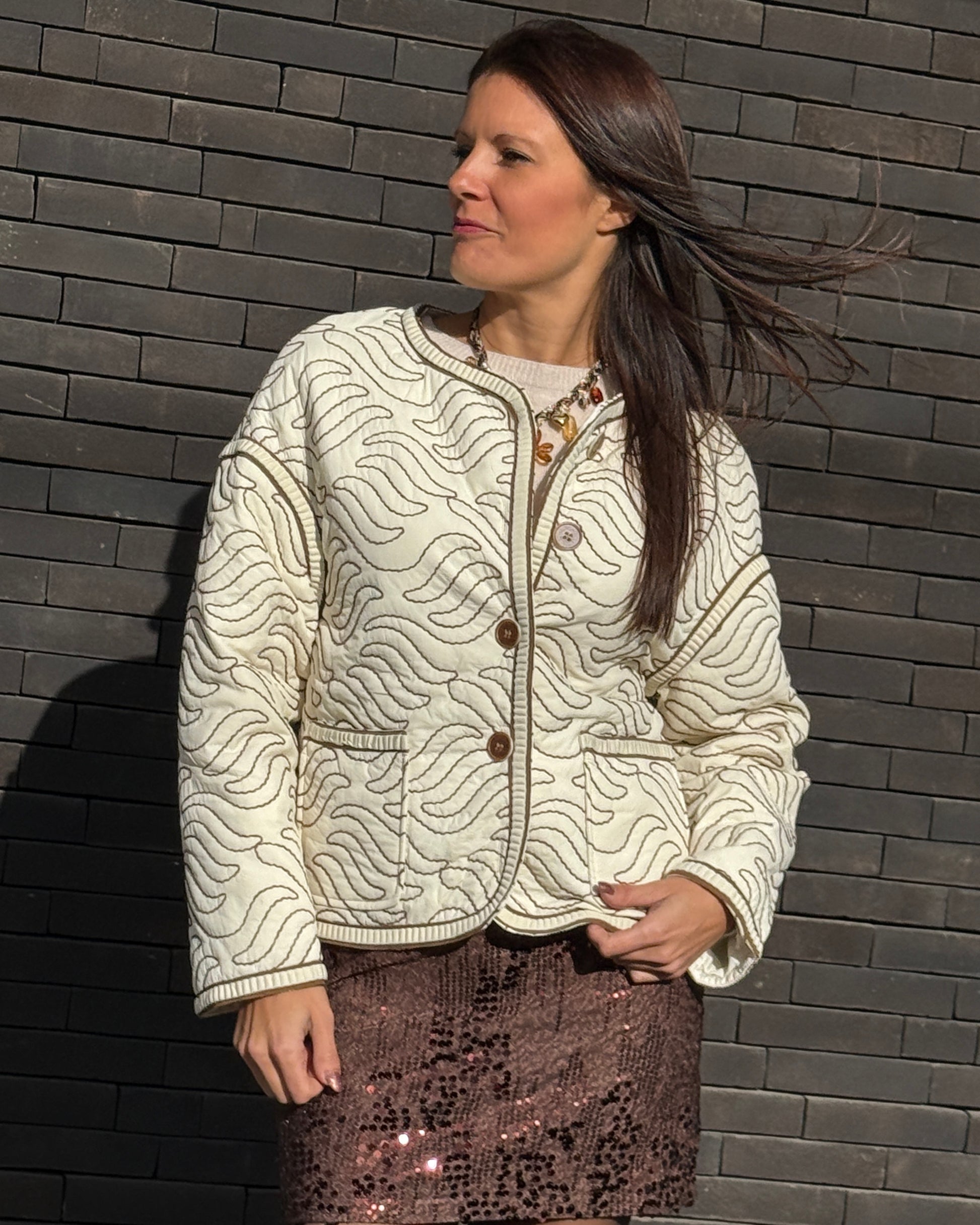 La veste Calista combine élégance et confort dans un style matelassé ultra tendance. Son fond crème réhaussé de motifs bruns crée un relief raffiné, idéal pour illuminer tes tenues de saison. Un coup de cœur pour sa coupe droite et sa matière douce, à la fois chic et décontractée.