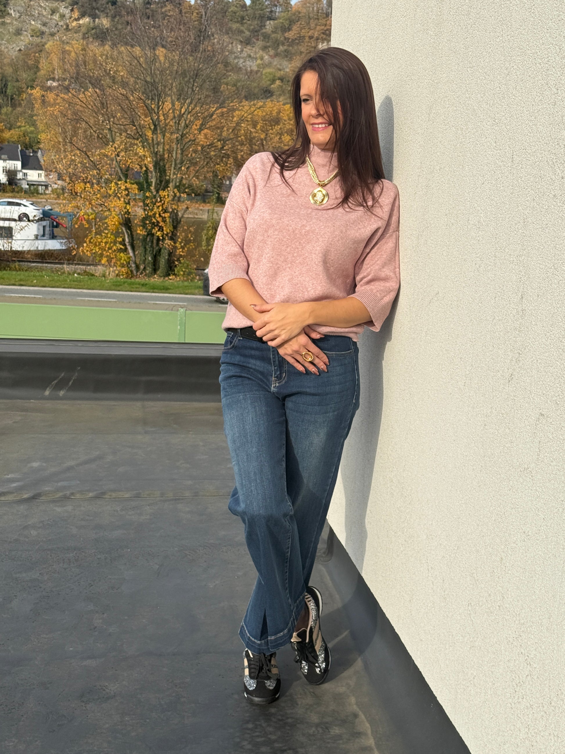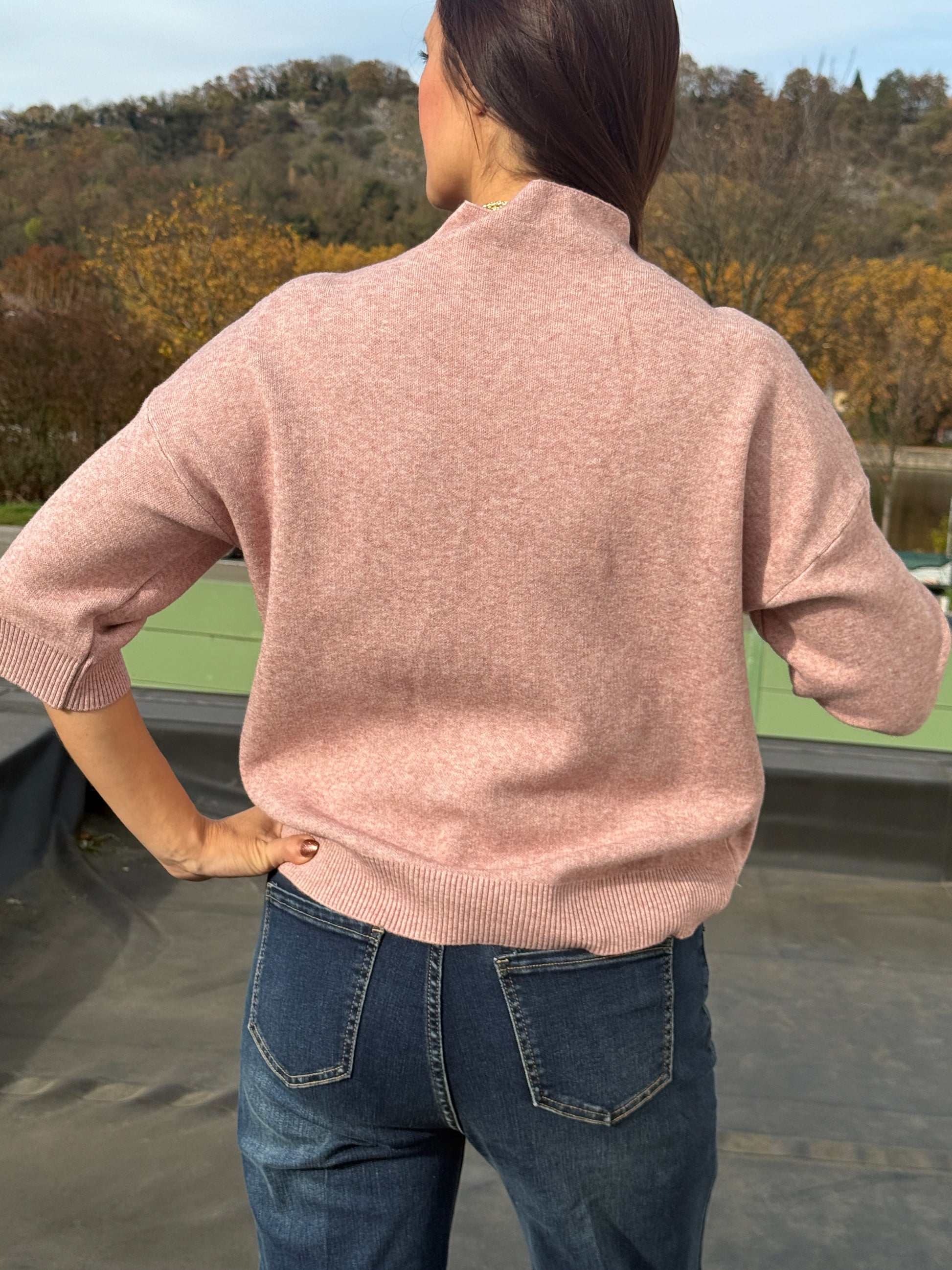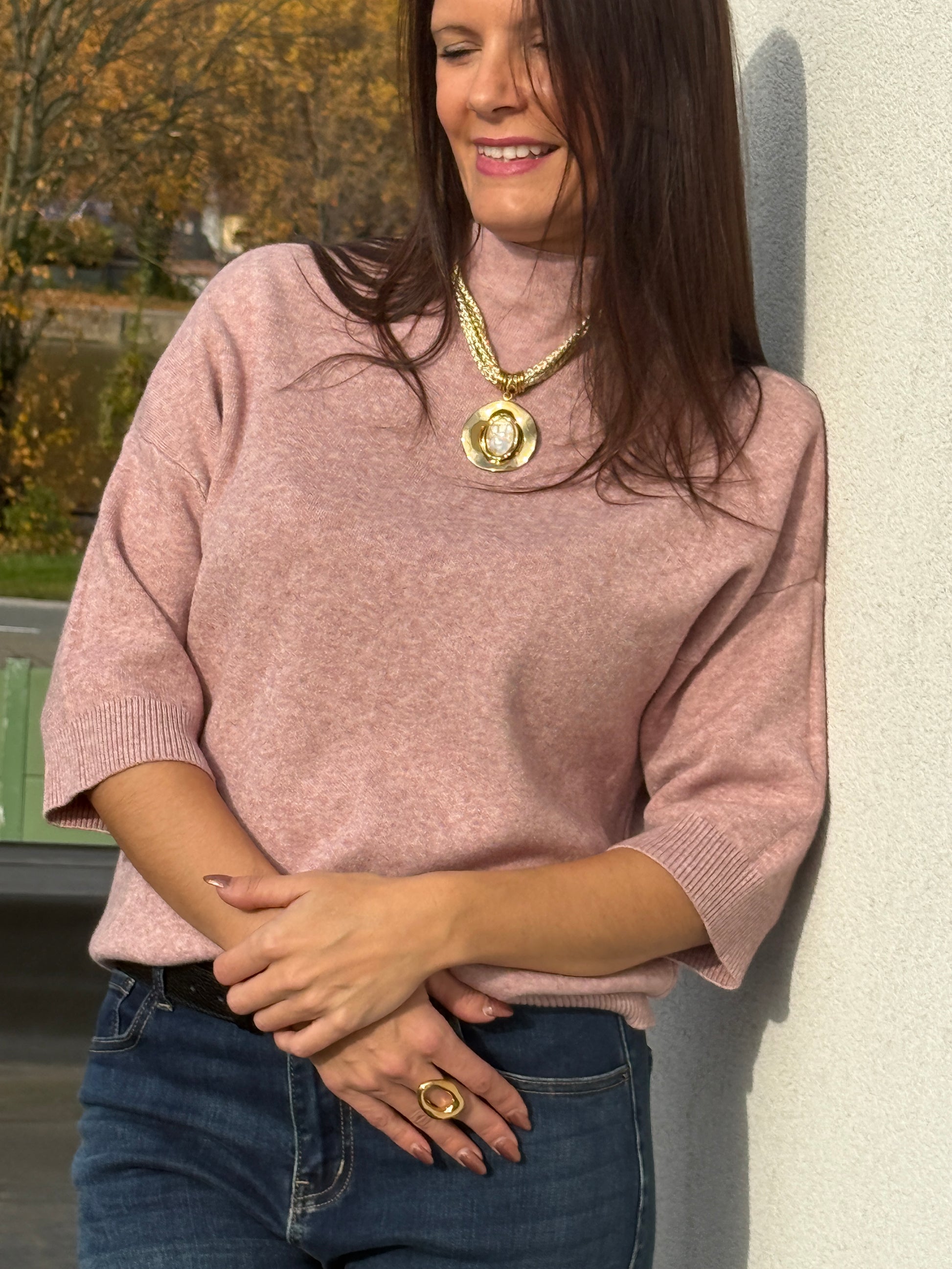 Douceur et élégance au rendez-vous avec ce pull rose poudré à la maille fine et légèrement chaude. Sa coupe droite et ses manches mi-longues en font une pièce facile à porter, aussi bien au bureau qu’en week-end.