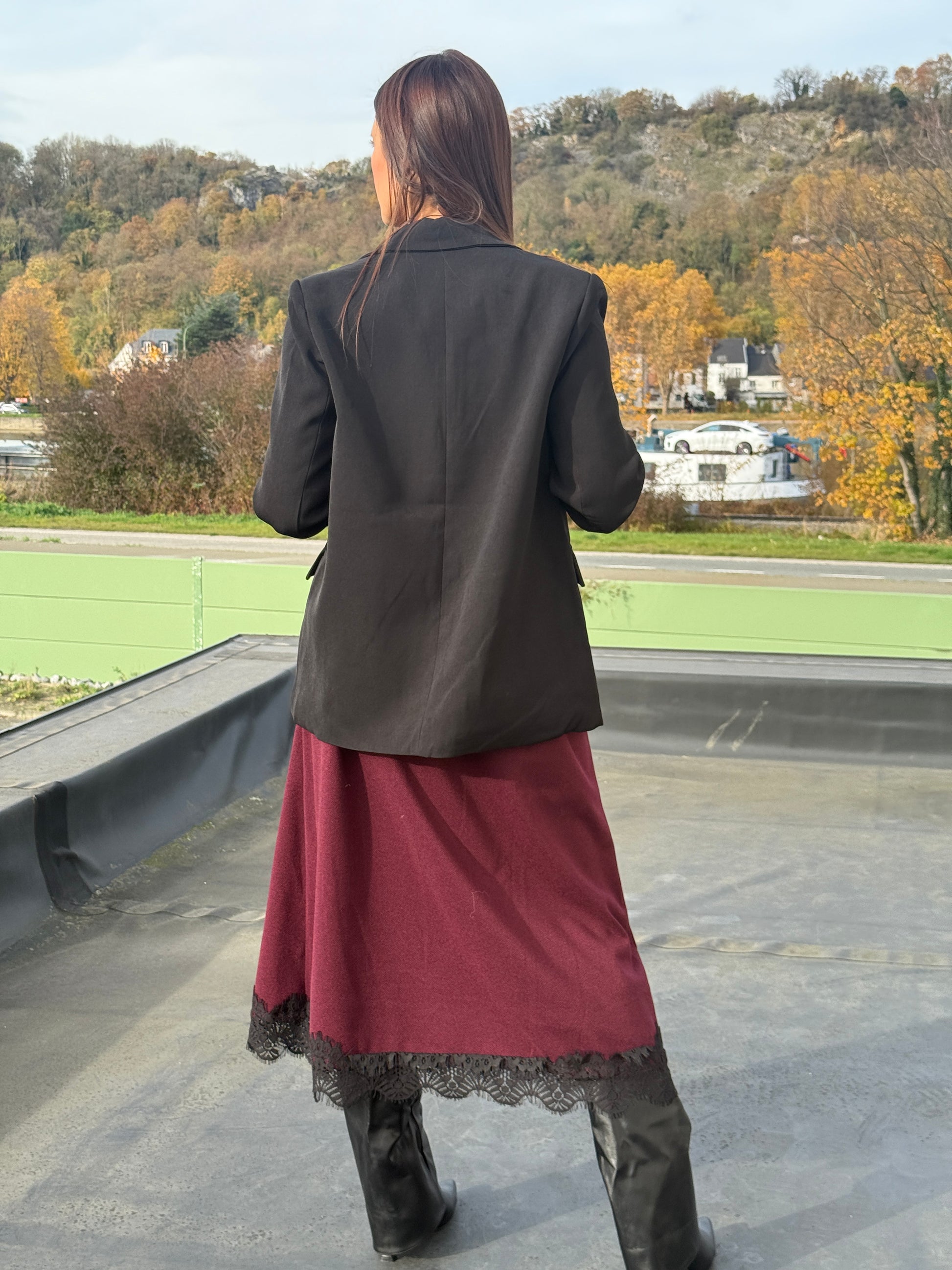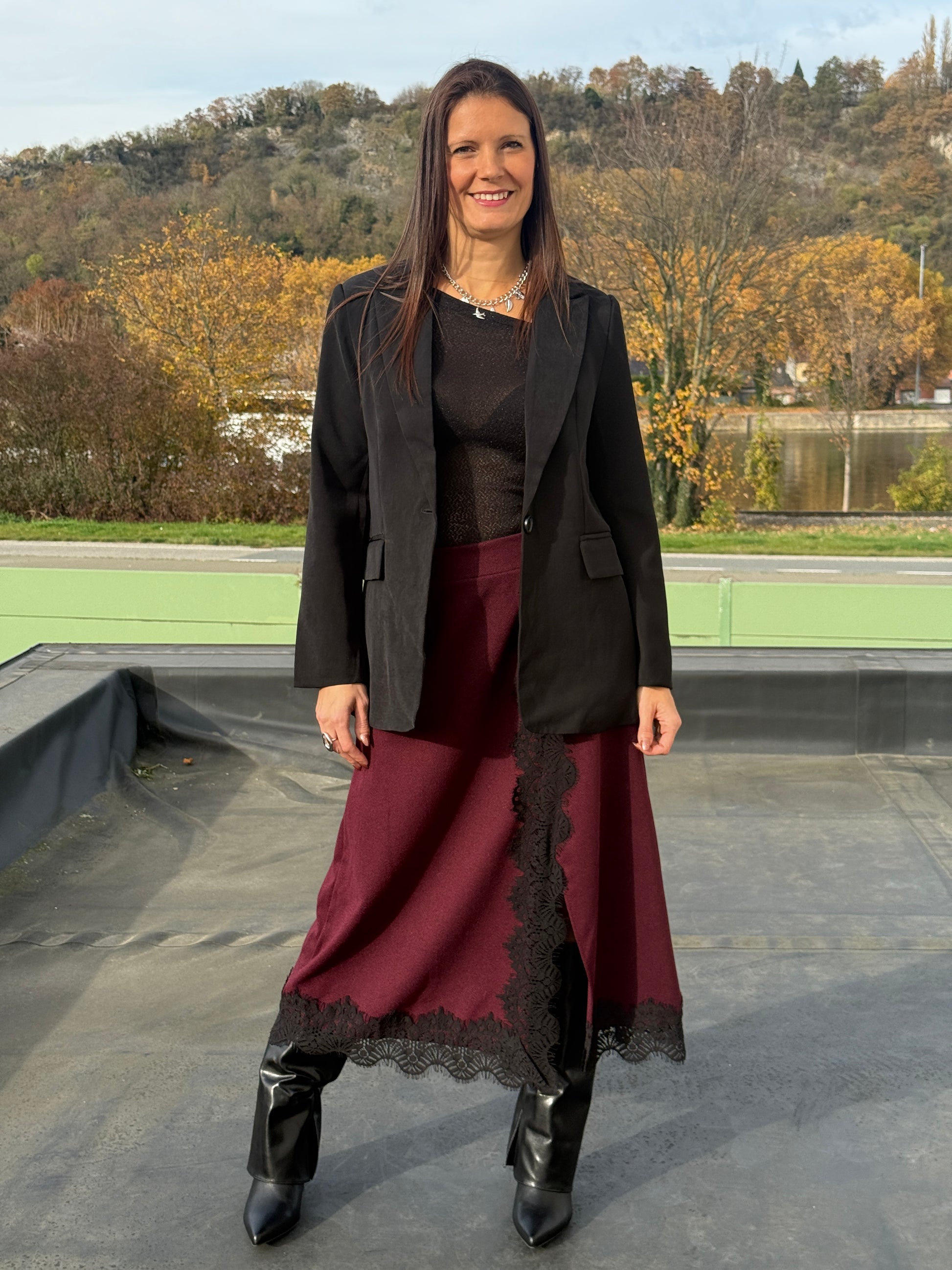 Élégante et féminine, cette jupe bordeaux en matière effet tweed sublimée par une délicate dentelle noire apporte une touche chic et raffinée à vos tenues d’automne.