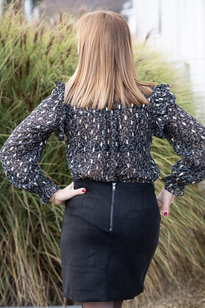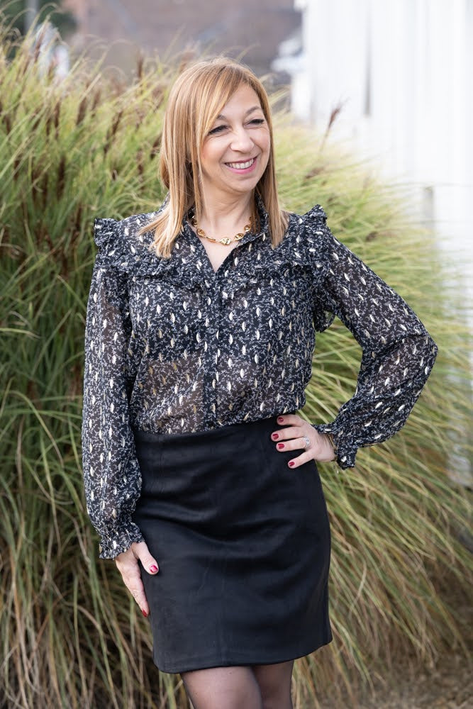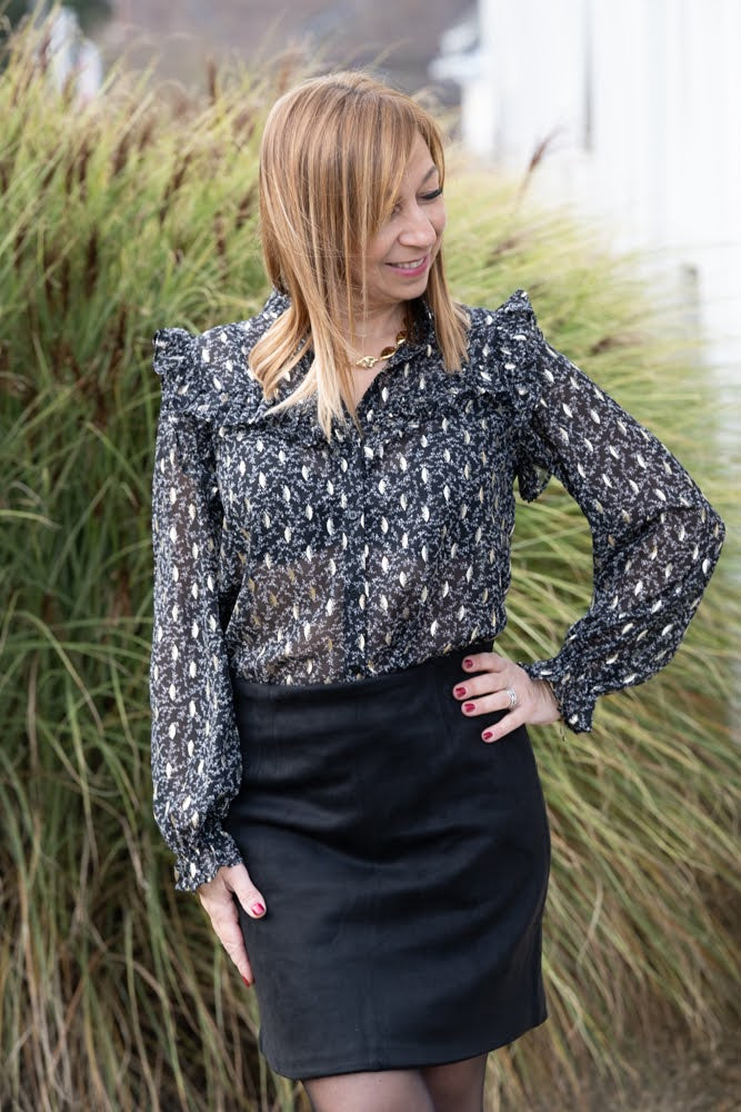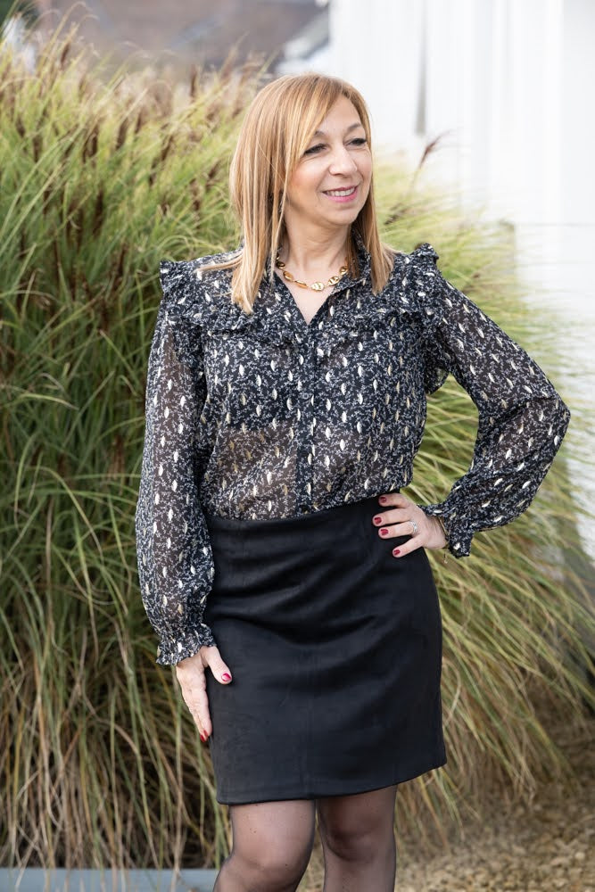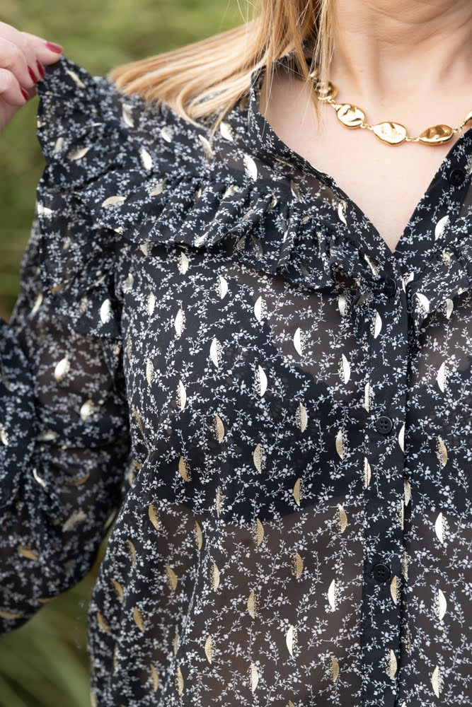 Un chemisier léger et féminin, sublimé par un motif délicat noir et doré.