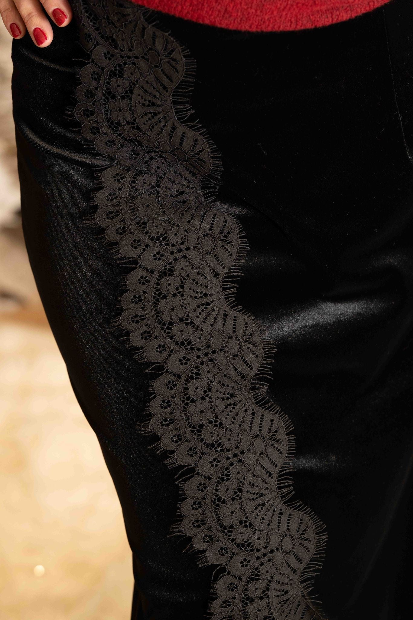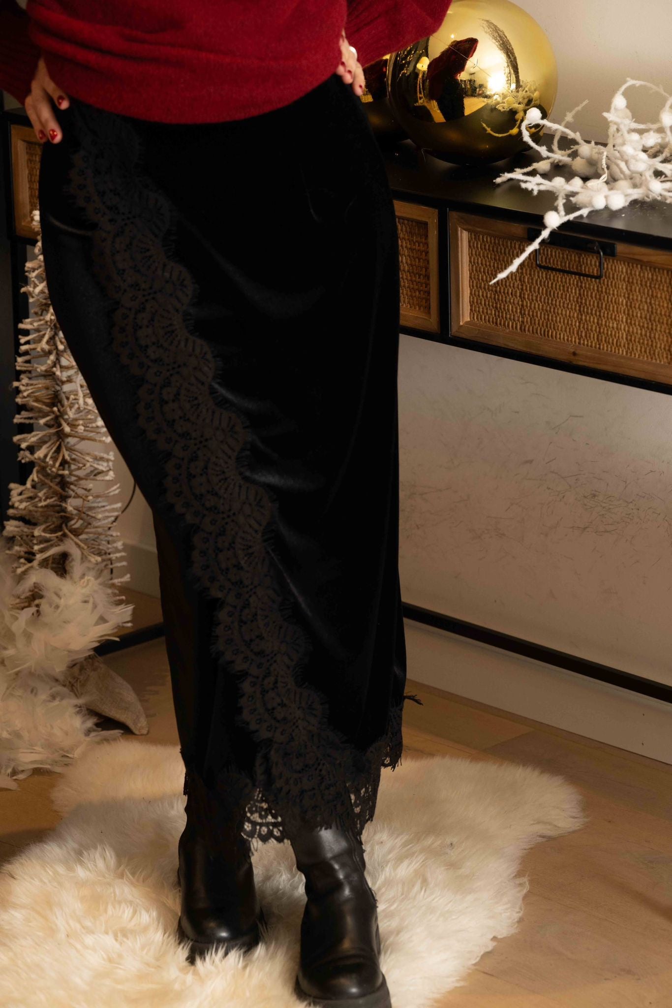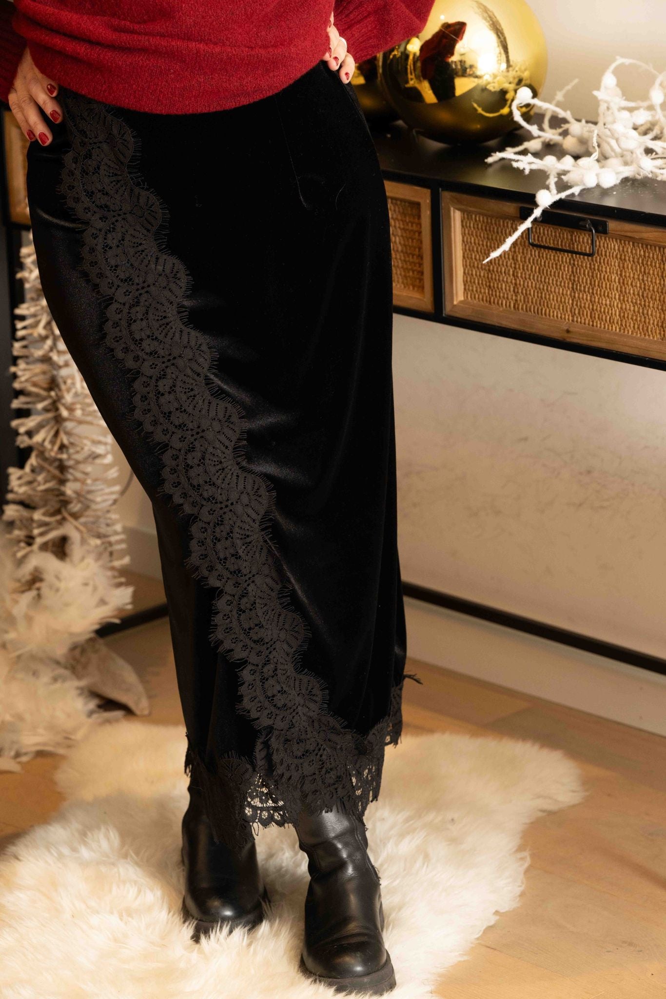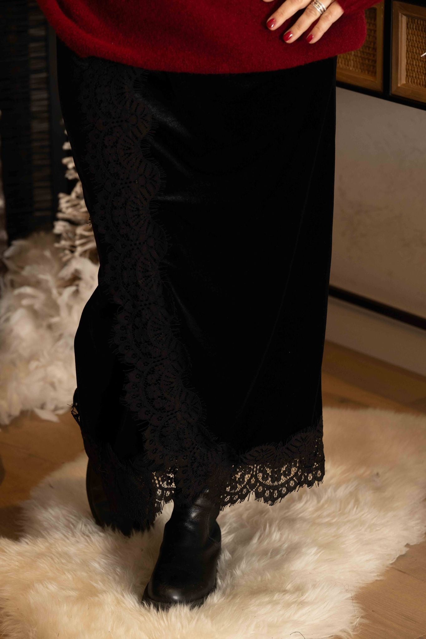 Une jupe longue en velours au tombé élégant, sublimée par une large bande de dentelle noire pour une allure chic et féminine.