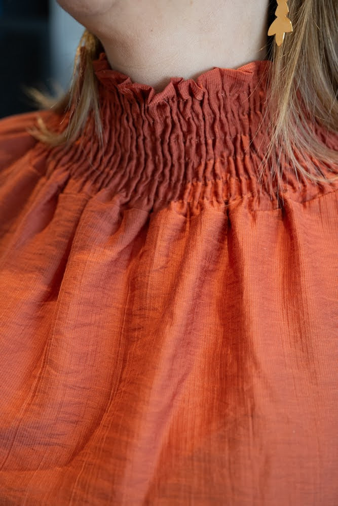 Un modèle élégant à col smocké qui apporte tout de suite du style, tout en restant fluide et confortable.