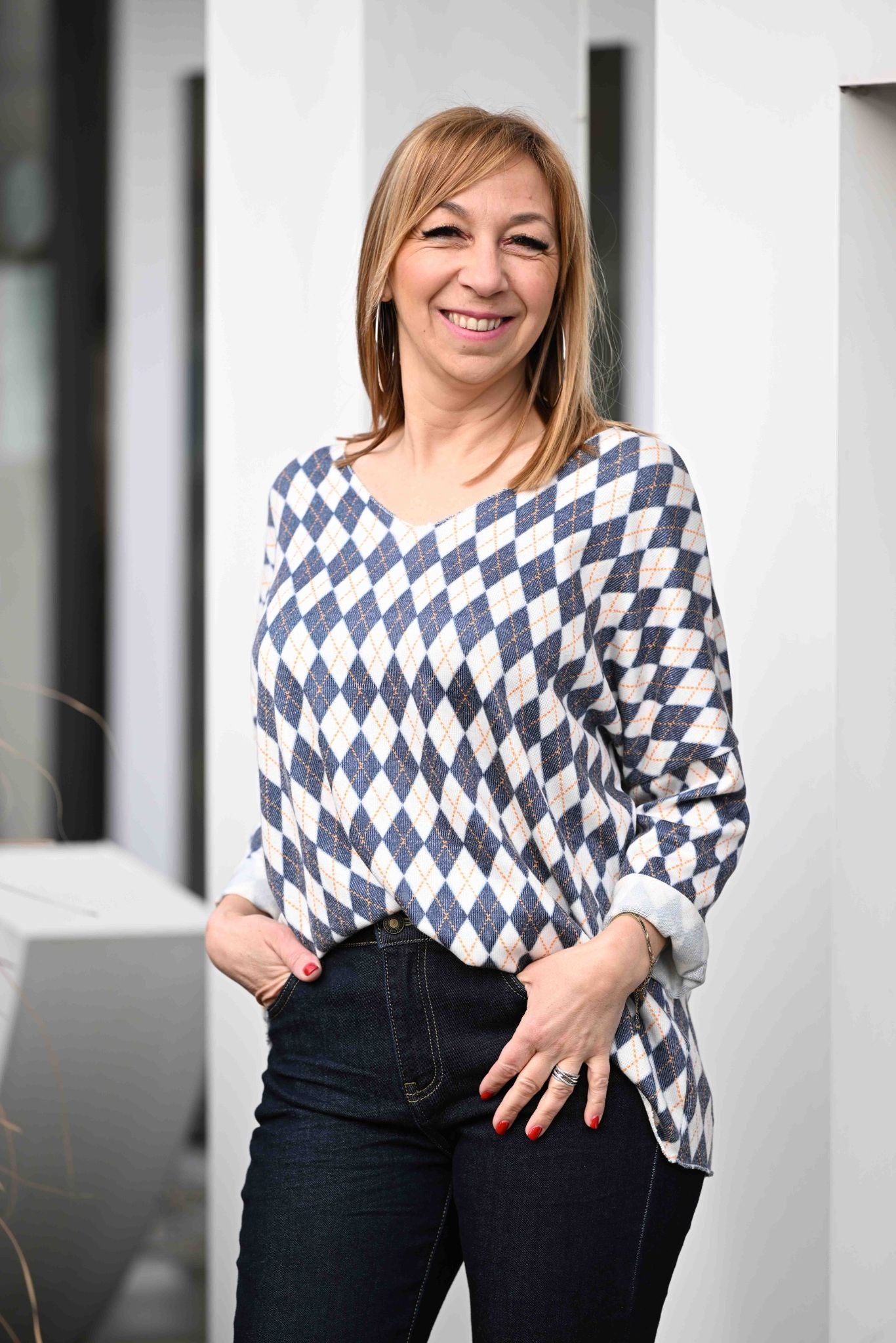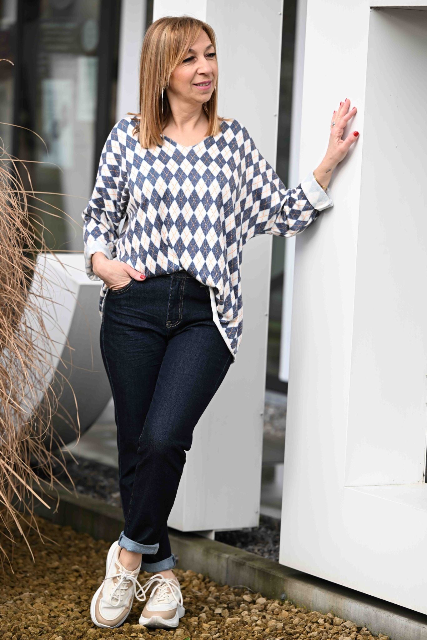 Un pull tout en douceur au motif losange, parfait pour apporter une touche fraîche et lumineuse à vos looks du quotidien.