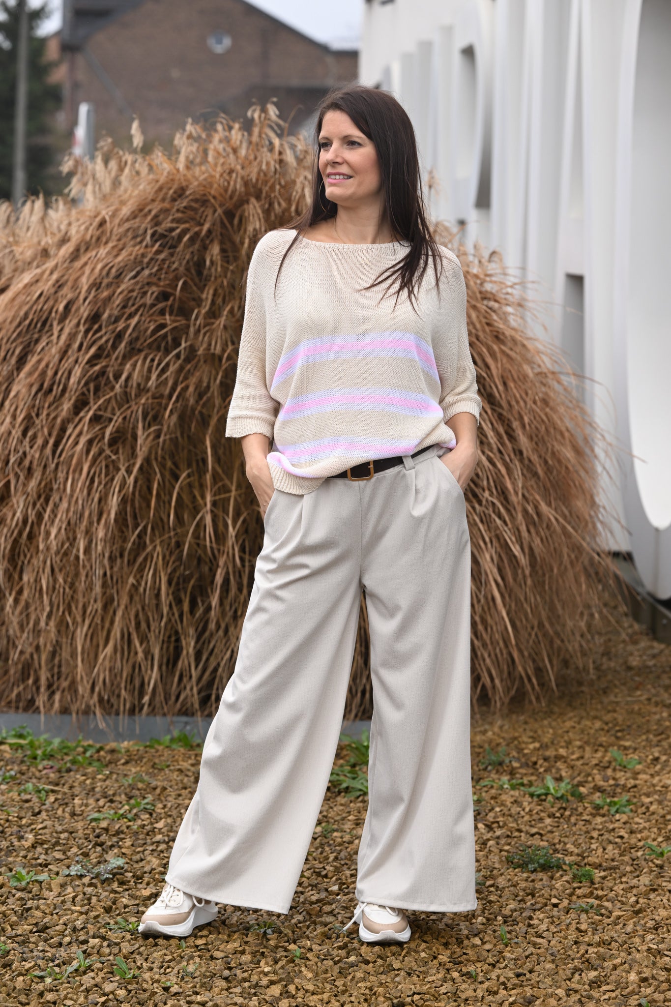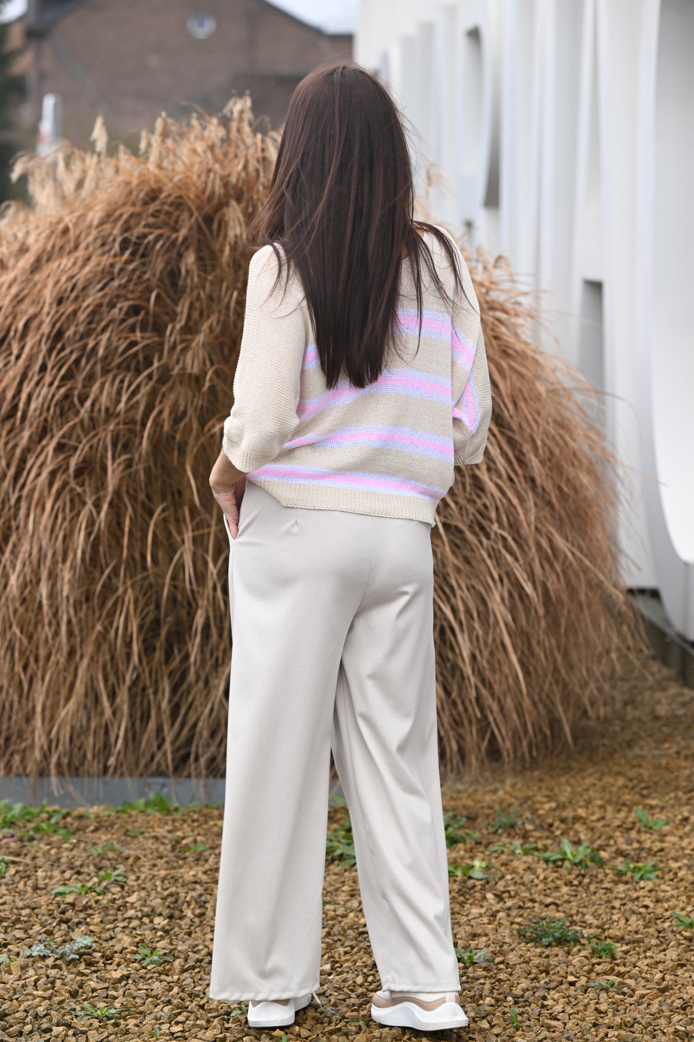 - Beige aux rayures pastel rose et bleu
