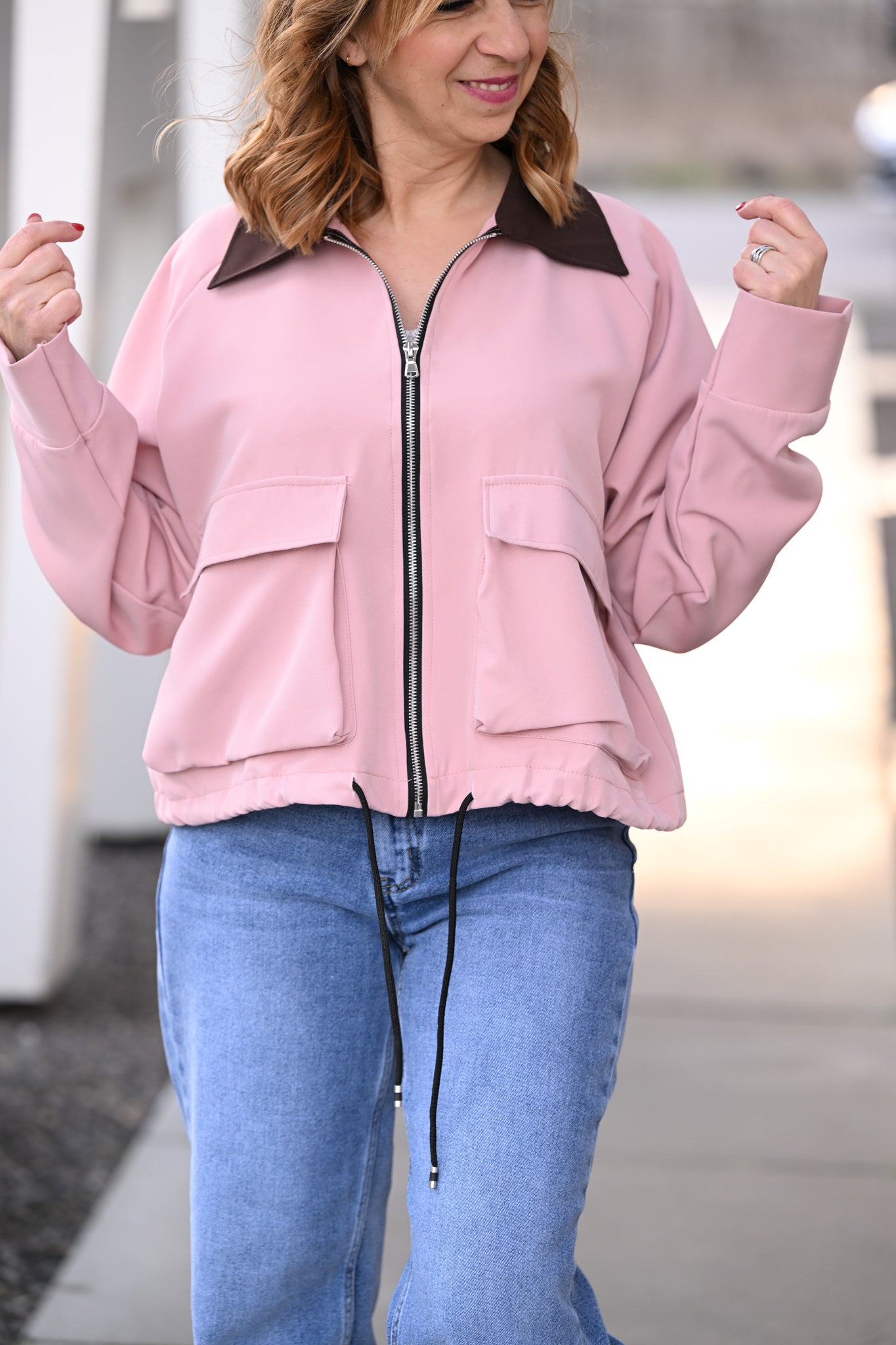 Une veste moderne et ultra tendance qui apporte une touche de douceur et de caractère à vos looks grâce à son rose poudré et son col contrastant.