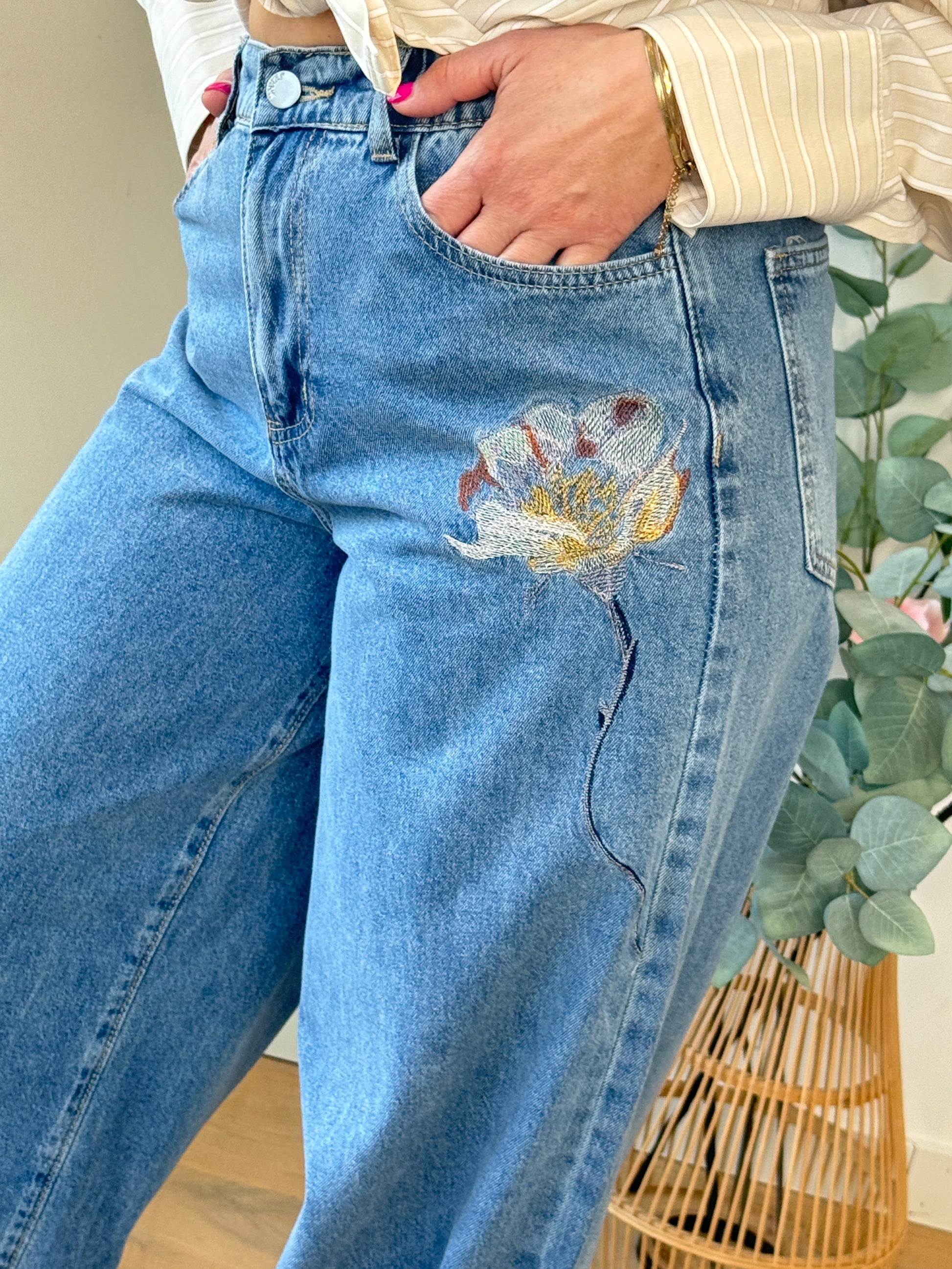 - Broderie en forme de fleur sur une jambe