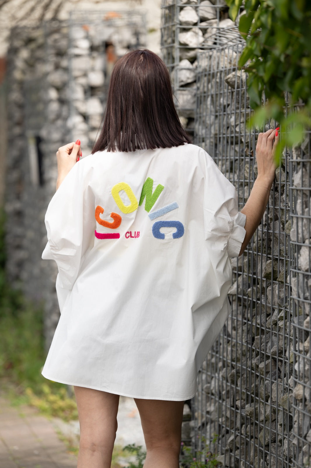 Un chemisier blanc revisité avec une touche fun et moderne grâce à son imprimé coloré dans le dos