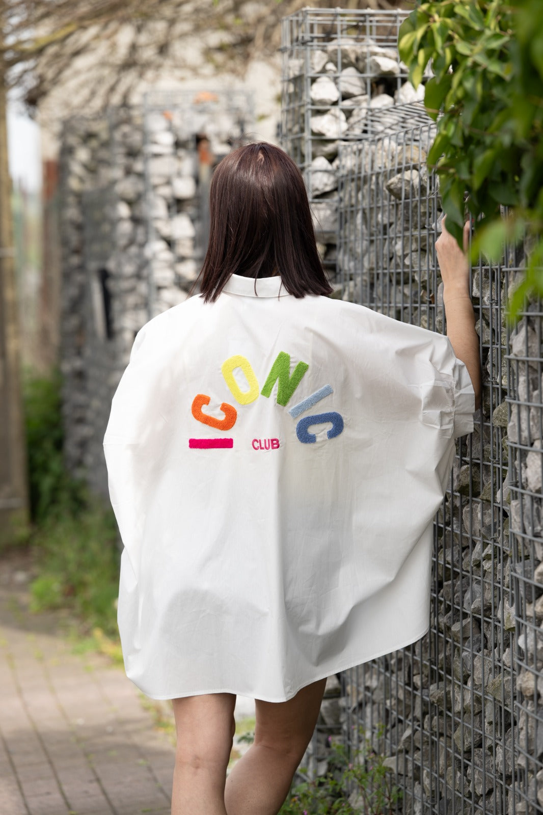 - Dos avec inscription “ICONIC CLUB” en lettres colorées texturées