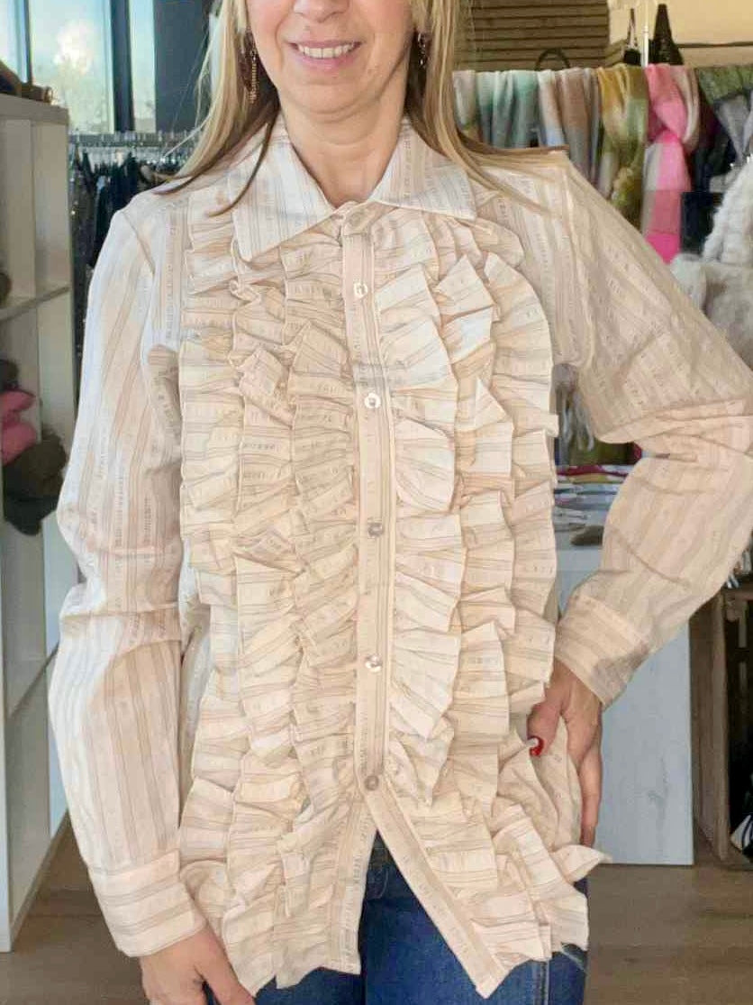 Chemisier féminin au charme délicat, sublimé par de jolis volants sur le devant et de fines rayures ton sur ton. Une pièce élégante et facile à porter au quotidien.
