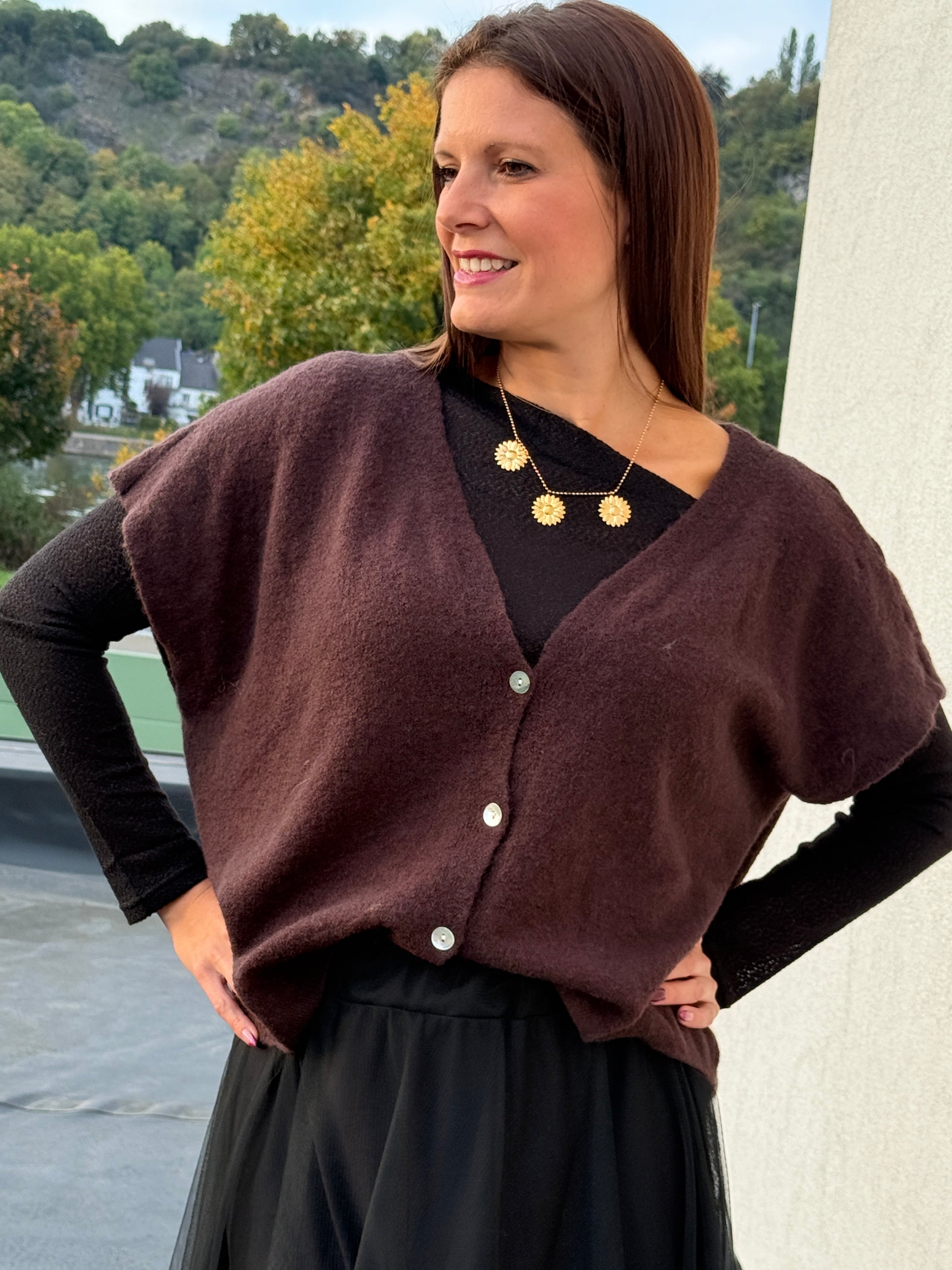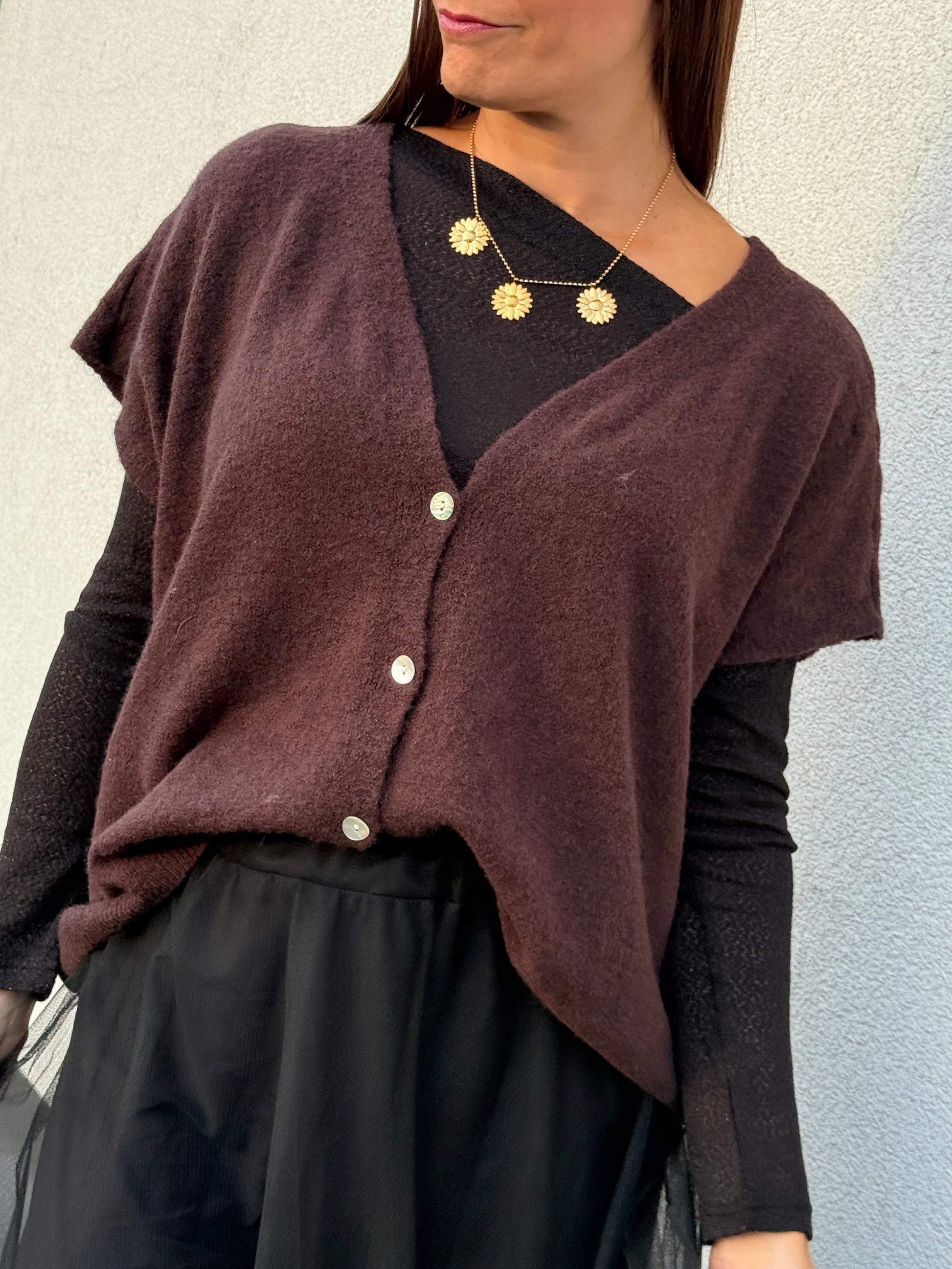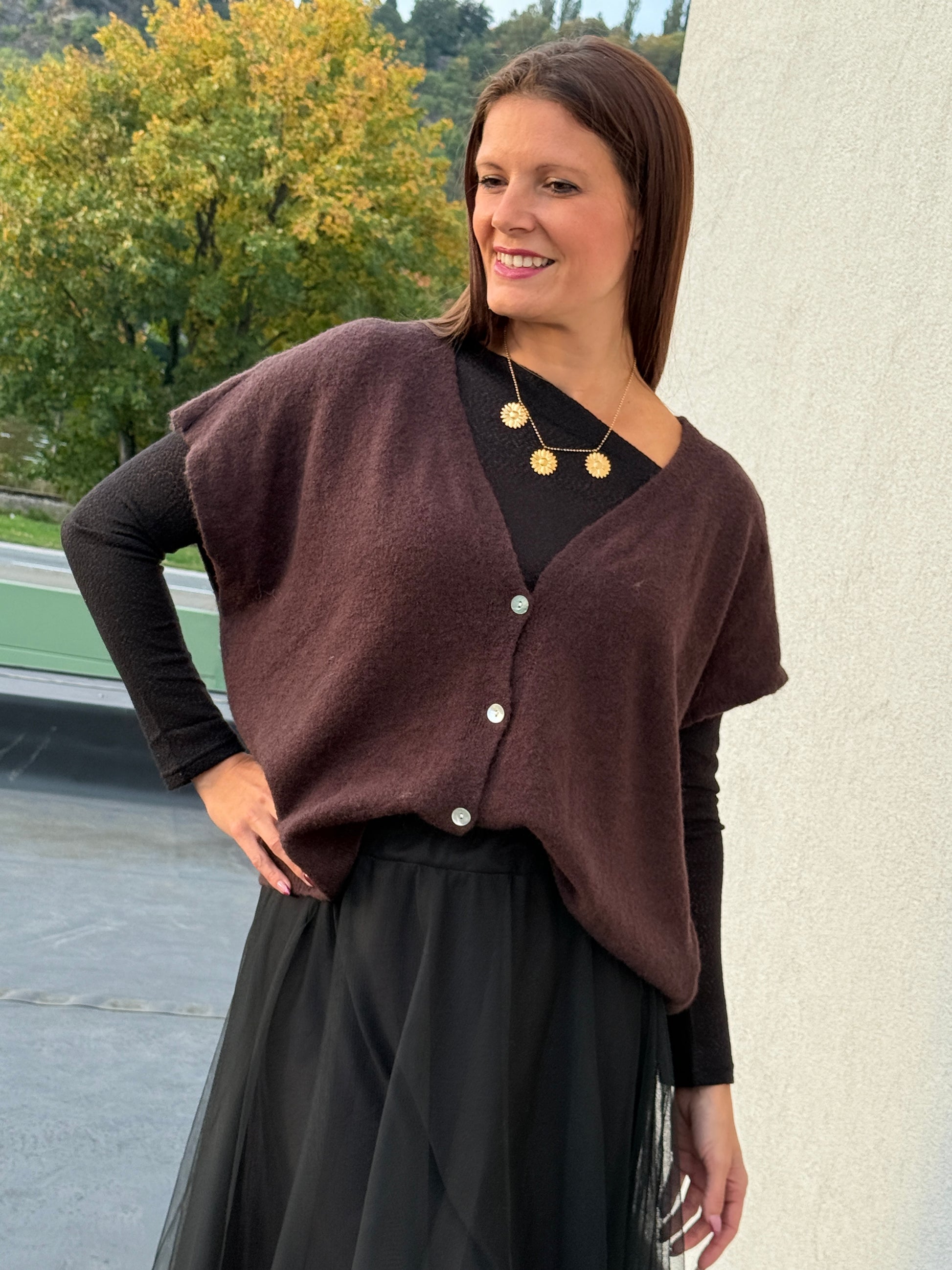 Douceur et confort sont au rendez-vous avec ce gilet sans manches. Sa coupe légèrement ample et ses boutons nacrés en font une pièce cosy et tendance, parfaite pour superposer sur une chemise ou un tee-shirt.