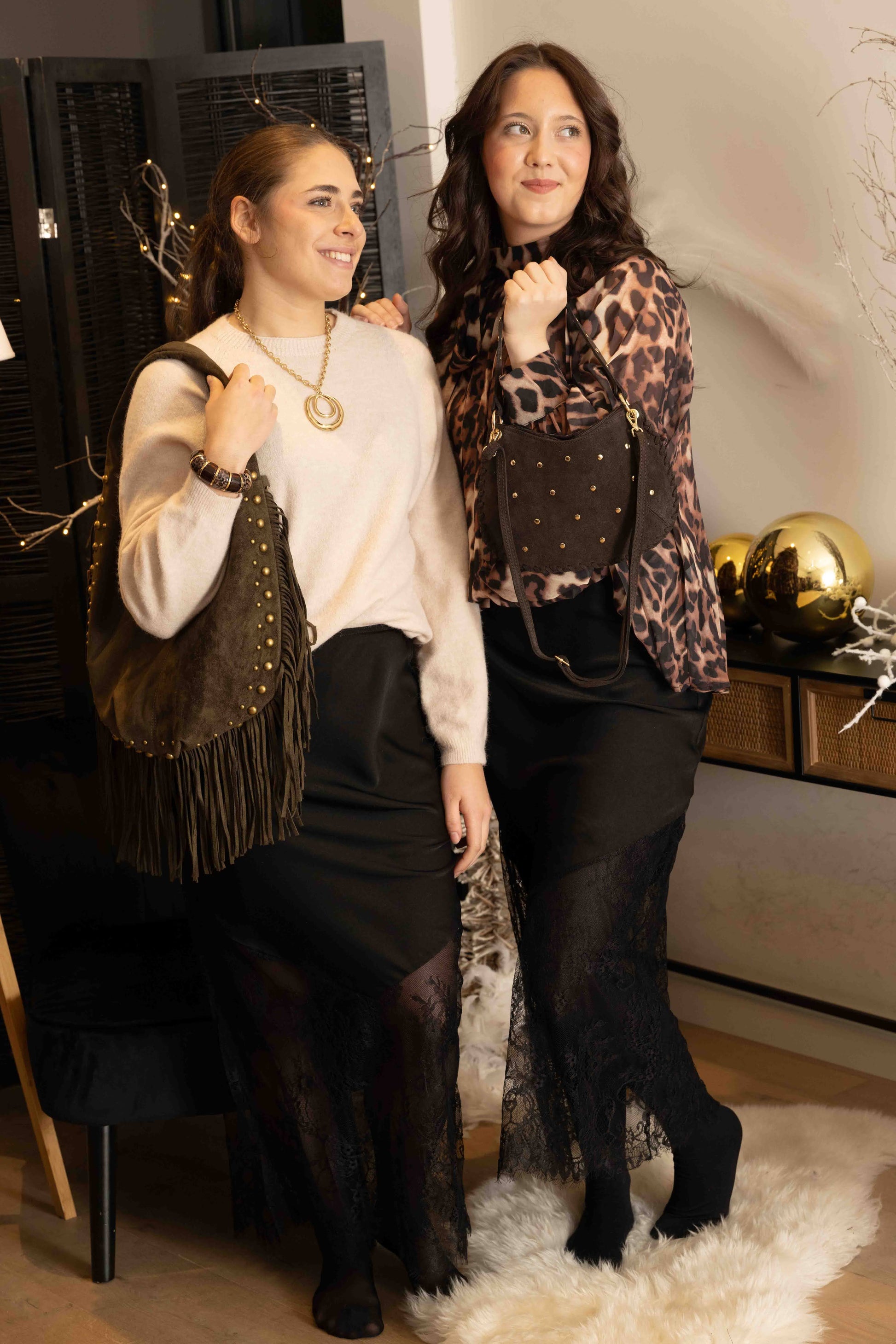 Un sac en nubuck au style bohème-rock, sublimé par ses franges et ses clous dorés. Pratique, tendance et parfait pour dynamiser tous vos looks.
