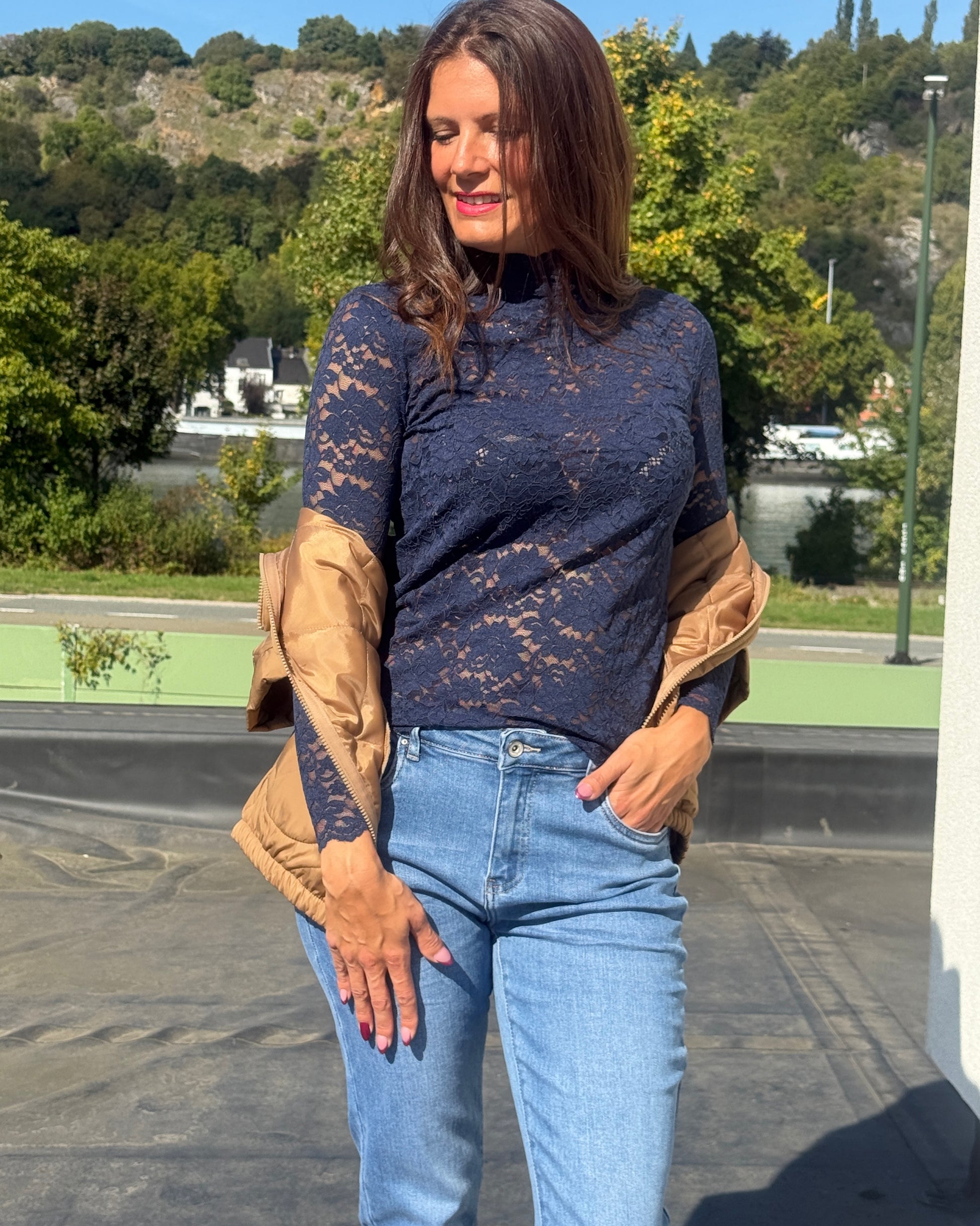 Ce sous-pull tout en dentelle joue la transparence avec élégance. Il se porte seul (avec un bandeau) pour un look affirmé ou en superposition sous un pull, une veste ou un gilet pour une touche de romantisme.